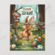 Bjud in dina gäster till ett påskäggsjakt med dessa charmiga och färgglada påskäggsjakt-inbjudningskort. Perfekta för alla äggjakter, dessa påskäggsjakt-inbjudningar sätter tonen för en rolig dag och visar en charmig scen med en kanin i skogen som håller ett färgglatt påskägg som den har samlat under jakten. Träskyltar visar datum och tid för påskäggsjakten och marken är strödd med färgglada påskägg bland gräset. Perfekta för att bjuda in gäster till alla familje- eller kommunala påskäggsjakter, dessa förtjusande påskäggsjakt-inbjudningar kommer att få gästerna att bli upphetsade över att delta i påskfirandet! Anpassa enkelt