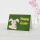 Illustrerad påskhare med korg med färgglada ägg på grönt med gul text Happy Easter och tom insida.