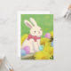 En söt illustration av en kanin med påskägg och gula blommor