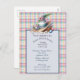 En färgrik fjäderprydd påskhatt omgiven av ägg pryder toppen av denna inbjudan.