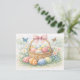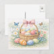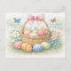 Detta vackra akvarell vykort visar en charmerande påskkorg fylld med pastellfärgade ägg, omgiven av ömtåliga vårblommor och fladdrande fjärilar. Den mjuka handmålade stilen och de skira färgerna skapar en lätt, glad atmosfär som perfekt fångar påskens anda och vårens friskhet.
