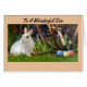 Det enorma fotoet av en kaninsitta bredvid en gruppera av kulöra ägg, presenteras på detta påskkort för en son. Bekläda av kort läser, "till en underbar Son", och insida av kortet läser, "maj som din påsk är lycklig. Vi älskar dig mycket"! En underbar långt som önskar din son en glad påsk!