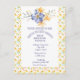Påskblommor i gult och lila dekorerar toppen av denna inbjudan.