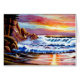 Målning av en strand vid gryningen med krasch vågar och fiskmåsar mot en färgstark rosa och orange himlar.