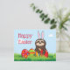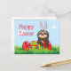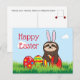 Glada påskhälsningar med en twist! En söt slarv som lekfullt bär kaninöron och kramar stora färgglada påskägg, för en avspänd, avslappnad feststämning. Det finns också två kawaii nyckelpigor på andra sidan av vykortet där hälsningarna finns. Ett färgglatt, verkligt upprymtande kort! Meddelandet kan anpassas. Perfekt för alla åldrar och samfund!