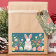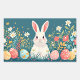 Söt vit kanin med blommig bakgrund och påskägg på båda sidor om kaninen