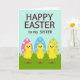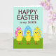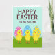 Designad med en blekblå bakgrund öppnas det här påskkortet med djup karmosinröd text längst upp som lyder ”HAPPY EASTER till min SYSTER”, där de första orden är större och resten är prydligt placerade under. Under texten står tre små gula fågelungar sida vid sida med sina små orange näbbar och fötter lätt vända mot varandra som om de delar en vänlig stund. Varje fågel har ett enkelt mörkt öga och en mjuk, belåten min som ger scenen en mild, omtänksam ton. Bakom dem sitter tre stora äggformade figurer likt säsongsdekorationer, arrangerade på rad för att rama in fåglarna. Det vänstra ägget är rosa med vita prickar, det mittersta ägget är ljusblått med mörkblå prickar och det högra ägget är gult med ljusblå fläckar, vilket ger ett genomgående glatt mönster 🌷. L