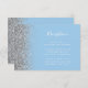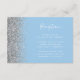 Den lämnat kant i eleganten har ett modernt mottagningskort för bröllopsdagar som har en silver faux glitter-utformning. Med anpassadet text kombineras vit handskrift, tryckplåt och kursivt typsnitt på en pastellbakgrund baby blue. Den omvända sidan har en matchande design för blått och silver glitter.