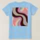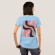 Det här är en digital konstbild som har en snabb mönster av burgundi, rosa och blek gult färg. Designen skapar en spiral-effekt med ett texturerat utseende längs kant. Paletten färg övergår från burgundi i mitten till mjuka rosor på yttre kant, med gult av blek. Struktur har en kornig, konstnärlig kvalitet. Mönster är abstrakt och vätska, med blandning och rotation av färg i ett cirkulärt rörelse. Bakgrunden har en struktur som lägger till djup och visuellt intresse. Sammansättningen är en digital bild med mjuk, eterisk kvalitet. Bilden är på framsidan och baksidan av t-shirt. T-shirt är en ljusblå kvinnas grundläggande t-shirt.