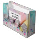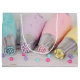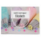 En födelsedagspressning med ett foto av söt pastel färgad. Med dekorationskakor i pastellblått, rosa, persika och gult. Sätt på ett trä bord med lite färglöst pärlor. En vit rektangel med ett rosa gräns överst med personlig inuti.