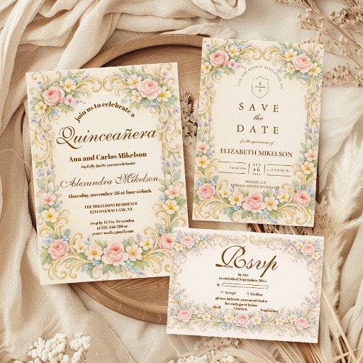 A romantic pastel composition framed with ornate champagne scrollwork and blooming blush, peach, ivory, and soft blue florals. The graceful baroque silhouette creates a timeless European-inspired border, while the warm parchment background keeps the design light and luminous. Balanced symmetry and delicate botanical detailing give this piece an heirloom-quality elegance. Perfect for a quinceañera celebration filled with softness, tradition, and refined beauty.