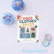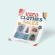 A colorful flyer advertising for a used clothes sales features subtle geometric patterns in soft pastels. The layout features a collage of various secondhand garments including vintage jacket, floral dress, and shirts arranged in an appealing grid format.