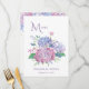 Pastel Hydrangeas Bröllop Menu designad med ljust blommigt bouquet på vit bakgrund. I texten på framsidan finns: Menu, Bride and Groom's Namn och Bröllop Date. Den omvända texten innehåller: Meny- och Appetizer-, Entre- och Dessert-markeringar. Om du vill anpassa dig infogar du bara dina uppgifter i vår enkla mall och ersätter exemplet.