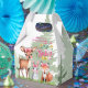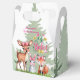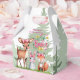 En vit vattenfärgsillustration av tre vackra djur som är placerade i en lush grönt-ängsskugga. Till lämnad sitter en hjort med stort öron, en fläckig jacka och en charmerande rosa på ett snyggt sätt. I mitten sitter en grått-kanin upprätt, sport en motsvarande rosa båge. Till högerna har en lekfull räv med en orange jackat och vit underklockning också en rosa båge. Pastellpaletten och mjuka detaljer i färg skapar en scen för bål och hjärtan, perfekt för älskare av natur och charm.