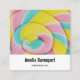 Affärskort med ett yummifoto. Ett makrofoto av en lollipop. Blått rosa och gult pastel färg i spiral mönster.