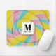 Mousepad med ett yummifoto. Ett makrofoto av en lollipop. Blått rosa och gult pastel färg i spiral mönster.