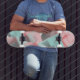 Skateboard avslappnad contemporary snyggt seaglass mynta grönt, pastellkorall rosa och ljus och mörk grått färgad polygon mosaic art mönster. Konstruktion för finare konstnärliga konst mode diva, den populära höftledaren, vintagen eller stil motif älskare för abstrakt konst.