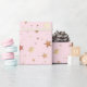 En sömlös mönster med guld och ro guld stjärnor av varierande storlek som är spridd över en mjuk bakgrunds rosa. Utformningen har en mjuk, drömmande känsla med en subtil metallisk shine, perfekt för att lägga till lite stollig och elegans.