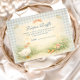 En charmig saga-inspirerad babyshower-design med en söt akvarellgås som står bredvid en rede fylld med pastellaid ägg. Ömtåliga vårblommor och mjuk grönska skapar en lugn lantlig scen, medan en rosafärgad rosett och en salvia-rutig bakgrund tillför en mysig stuga-känsla. Den vintage-inspirerade illustrationsstilen och den mjuka pastellfärgspaletten ger designen en fantasifull barnkammarsfär, perfekt för en lekfull och hjärtlig babyfirande.
