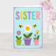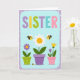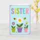 Detta kort har ordet ”SISTER” längst upp i stora rundade bokstäver, alla i en annan pastellfärg som lavendel, gul, lime, teal och rosa. Under texten sitter tre krukor i en prydlig rad, som en liten delad fönsterträdgård som känns vänlig och nära ❤️. I mitten finns en vit tusenskönsaktig blomma med en solig gul mitt, planterad i en lila kruka täckt med små vita prickar. Till vänster växer en lila blomma med gul mitt ur en limegrön kruka med mjuka åsar, lutad som om den poserar för ett sött foto med de andra. Till höger står en högre gulblommig blomma bredvid en mindre violett blomma i en mjuk rosa kruka med små vita prickar, vilket ger gruppen ett mysigt, kamratligt utseende 🌼. Små randiga flygande insekter med vita vingar svävar nära blommorna, med en liten insekt som vilar nära