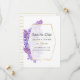 Vattenfärgviolett - lilac- och lila blommigt bröllop spara datum-kort med guld geometriskt ram-anpassade till händelsespecifikationerna.