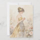 This Sweet Sixteen invitation design conveys elegance and delicacy with a romantic pastel style. The illustration shows a young woman wearing a golden and gray strapless gown, surrounded by soft flowers, with a blurred background that adds serenity and harmony. The composition creates a romantic, charming, and sophisticated atmosphere, capturing a moment of contemplation and joy with a watercolor effect that highlights softness and warmth.