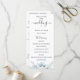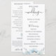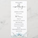 Dammiga blå akvarellblommor och lövverk, bröllopsprogram. Programmet har söt kalligrafi "bröllop" accent med flera rader för anpassade textlistor för ceremonieordning, bröllopsfest och tacknota.