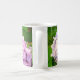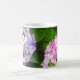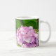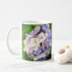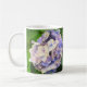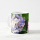 Ett fotografi av blå och lila hydrangeor på en kaffekopp.