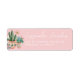 Denna returadress har målad konst av ökenkaktus i mexikanska krukor på en rosa bakgrund med vit text. Färgerna inkluderar grön, rosa, gul, blå vit och korall.