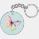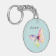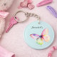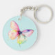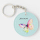 Whimsisk akvarell fjäril design med mjuka pastell regnbågsfärger inklusive rosa, lavendel, akvamarin, gul och persika på en ljusblå bakgrund. Konsten använder en delikat handmålad akvarellillustrationsstil i kombination med elegant kalligrafi skript bokstäver, vilket skapar en drömsk och feminin estetik perfekt för flickor, personliga presenter och lekfulla accessoarer.