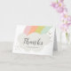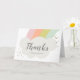 Ett modernt barn tack-kort med en välvd pastellfärgad regnbåge och vita fluffiga moln med stort anpassningsbart tack och barnets namn. Insidan har en yta för ett anpassat meddelande eller så kan du ta bort det om du hellre vill skriva ett personligt tack för hand.