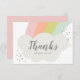 Ett modernt barn tack-kort med en välvd pastell regnbåge och vita fluffiga moln med stort anpassningsbart tack och barnets namn. Baksidan innehåller ett utrymme för ett anpassat meddelande eller ta bort det om du föredrar att handskriva en personlig hälsning.