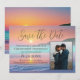 Spara datum Bröllopskort med vackra eleganta pastellfärger av solnedgången på stranden. Turkosblå, lila och orange solnedgång ombre-färger skapar en fantastisk blandning av tropiska nyanser för ett strand-, havs-, kryssnings- eller solnedgångsbröllopstema. Underbar idé för planering av en paradisisk strandbröllopsceremoni på en öresort med denna vackra design. Bergssilhuett, glänsande soluppgång solnedgång i skymningen, med mjuka vågor och strandsand på havsstranden, perfekt för en destination, ö, tropiskt paradis kustnära nautisk händelse. Dela din kust hawaii, kalifornien, karibisk ö eller tropisk strandbröllop.