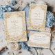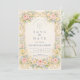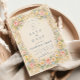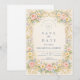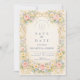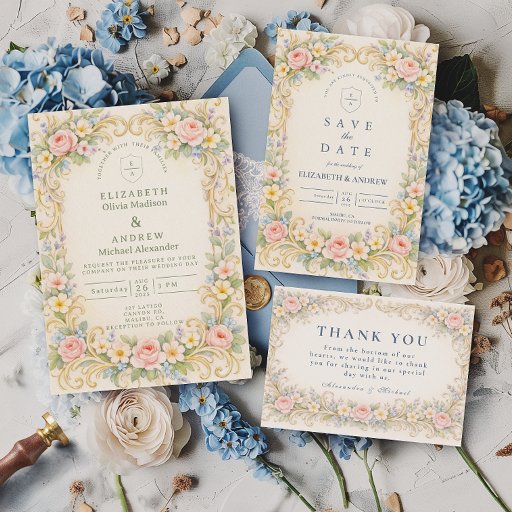 En romantisk pastellkomposition infattad i elegant champagne-rullning och blommande rosafärgade, krämfärgade och mjukt blå blommor. Ömtålig grönska flätar sig genom den utsirade barocka ramen och skapar en graciös europeiskt inspirerad silhuett runt mitten. Den varma elfenbensvita bakgrunden håller designen ljus och tidlös, medan den balanserade symmetrin ger en förfinad, antika känsla. Perfekt för par som dras till klassiska blommor med mjuk färg och sofistikerad detalj.