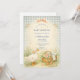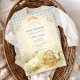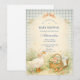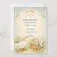 En charmig saga-inspirerad babyshowerdesign med en söt akvarellgås som står bredvid en rede fylld med pastella eggs. Ömtåliga vårblommor och mjuk grönska skapar en lugn lantlig scen, medan en rosafärgad rosett och en salvia-rutig bakgrund tillför en mysig stugkänsla. Den vintage-inspirerade illustrationsstilen och den mjuka pastellfärgspaletten ger designen en fantasifull nurseriesk känsla, perfekt för en lekfull och hjärtlig babyfirande.