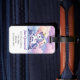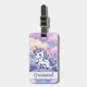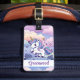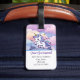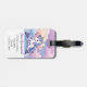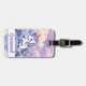 Den fina bagagetaggen med en söt tecknad vit unicorn med pastellblått, rosa och lila huvud och svan med en gult horn, hon står på lila gräs och omges av små stjärnor. Bakgrunden är en himmel-fullt av färgstarka pastellmoln. Under enhörningen är en mall som du kan lägga till ditt namn i. På baksidan finns samma bild med mallar för att lägga till ditt namn och information.