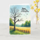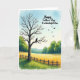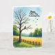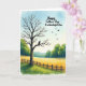 Denna design visar en mjuk akvarell-landsbygd med ett högt, stabilt träd till vänster, vars kala grenar sträcker sig upp i en blekblå himmel som bleknar mot vitt nära horisonten. En ensam mörk fågel vilar på en gren som en tyst följeslagare, medan några fler fåglar glider över, vilket ger en mjuk rörelse. Ett rustikt trästaket löper genom mitten och styr ögat över grönt gräs strött med små gula blommor mot ett brett gyllene fält som känns som sen eftermiddag. I fjärran sitter en rad löviga träd och låga rullande kullar tätt ihop, som gamla vänner som delar samma vy. I det övre högra hörnet är meddelandet “Happy Father’s Day To a Wonderful Man” placerat prydligt i en mörk, flödande bokstavsstil som sticker ut mot den ljusa himlen. De mjuka tvättarna och de ljusa texturerna ger
