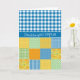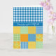 Ett födelsedagskort i chic, med hälsning på walesiska och en blandning av "n'match mönster of Blue and White Check Gingham och ett faux-lappverk av Daffodil mönster.