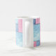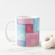 Ett söt vitt kaffe mugg med ett lappverk av rosa och blådenim mönster, från en handmålad vattenfärgsdesign av Judy Adamson.