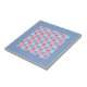 En attraktiv platta, för använda som trivet, med ett lapptäcke mönster i rosa och blå denim färg, från en handmålad vattenfärgsdesign av Judy Adamson.