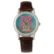 Stil, färgad,, tjuvaktiga pricklappsverk uggla stod på blommar träd gren med ornatblå bakgrund.