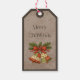 Lägg till en mysig, traditionell touch på dina julklappar med denna rustika julklappsetikett, med en brun textildesign inspirerad av klassisk juteväv. Det varma, naturliga utseendet är parat med en charmig lapptäcksstil-billustration med en söt rosett och julholmsgreen i traditionella julfärgerna röd, grön och vit, vilket skapar en tidlös festlig estetik.