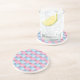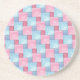 En attraktiv, sandstensdrycksmatta eller underlägg, med ett lappverk av rosa och blå denim mönster, från en handmålad vattenfärgsdesign av Judy Adamson.