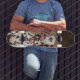 La patineta presenta un diseño visual de un perro Dálmata. La representación del perro en la patineta es de un Dálmata sentado al aire libre. El diseño captura la imagen de un perro de la raza Dálmata en una posición relajada, disfrutando del entorno al aire libre. La elección de un perro Dálmata como tema del diseño sugiere la presencia distintiva de manchas en blanco y negro, características típicas de esta raza canina. La combinación de la funcionalidad de la patineta con la estética del diseño de un perro Dálmata sentado crea una pieza única que fusiona la diversión asociada con el uso de una patineta con la apreciación estética y el carácter distintivo de la raza de perro elegida.