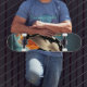 La patineta tiene un diseño visual de una impresionante orca saltando fuera del agua. La imagen que evoca es la de un pez orca, también conocido como ballena asesina, mostrando su poder y gracia mientras realiza un salto espectacular. La representación en la patineta destaca la majestuosidad y la fuerza del animal marino, capturando su movimiento dinámico y la sensación de libertad asociada con su salto. Este diseño proporciona una estética única y llamativa a la patineta, fusionando la belleza de la naturaleza con el estilo urbano del deporte.