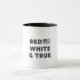 Mugg har en djärv och patriotisk design med frasen "RED WHITE & TRUE" i det kapitaliserade brev. Utformningen innehåller en bild av flagga United Stater i gråskala, placerad på textens höger. Den här mugg är gjord av högkvalitativ, hållbar keramik och är en perfekt för att visa ditt nationella pride samtidigt som du njuter av dina favoritdrycker för hett eller kall. Den vibrerande designen gör det till en utfällbar biet för vilket kök eller kontor som helst.