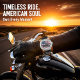 This watch face features a black bagger-style motorcycle, centered against a dynamic American flag backdrop that radiates outwards. A stylized sun is setting on the horizon behind distant mountains. The design combines patriotism with a love for motorcycling, clearly displaying white watch hands and numbers for time-telling.