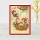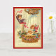 Födelsedagskort med barn som rider i en luftballong, inklusive en pojke som bär ett rött streck som viftar en amerikansk flagga. Basket i luftballongen dekoreras med röda blommor och blått rosett band.