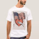 En ritad T-shirt-design med en centrerad vektor som illustrerar en fakturerande flagga, rik i detalj, överdragen med en hand placerad över ett hjärta. Denna minimalistiska, men ändå kraftfulla utformning symboliserar orubblig patriotism och lojalitet. Med en solid bakgrund är illustrationen idealisk för att skapa utträde, meningsfulla kläder för dem som är stolta över att visa sitt kärlek för sitt land. Perfekt för evenemang, firande eller daglig bära!