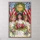 "Från varje bergssida: Låt Frihet ring!" Tre flickor som bär vita klänningar och som håller buketter av ro, står under en lagerandekrans i ord "Fred". USA:s flagga är bakbunden till denna vintage patriotiskt vykort från 1912.